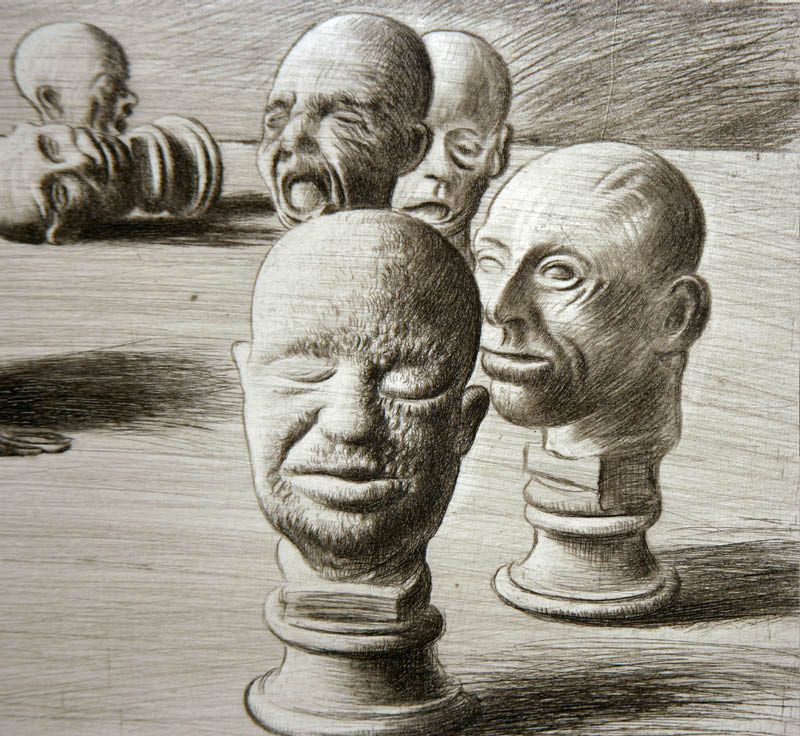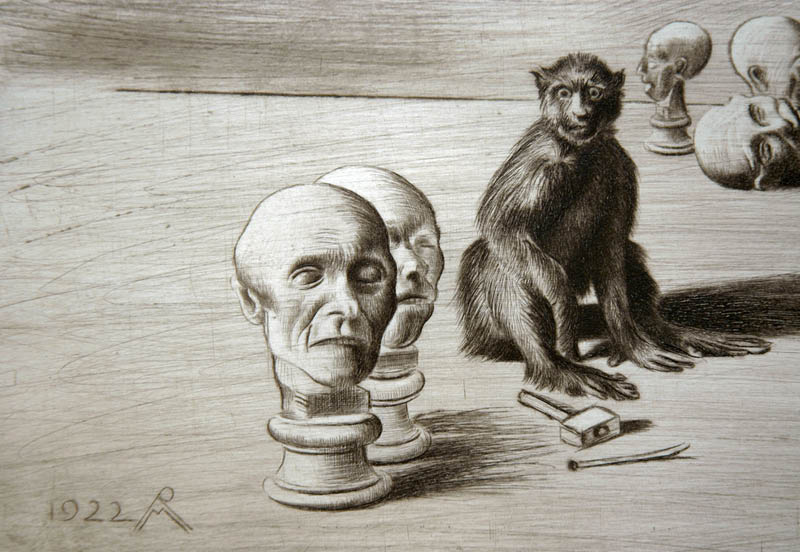 Richard Müller (1874-1954),ein ziemlich ratloser Affe, zwischen Gipsköpfen sitzend,a